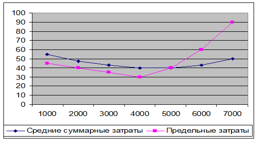 Рис.7 Графики средних суммарных затрат и предельных затрат на единицу товара