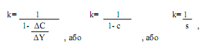 де: k – мультиплікатор інвестицій; ΔY – приріст національного доходу; ΔІ – приріст інвестицій.