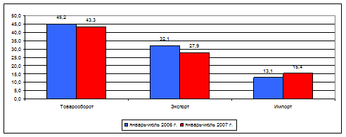 Прирост экспорта (в стоимостном выражении) в августе 2007 г., по оценке Минэкономразвития России, после июльского ускорения вновь оказался примерно на июньском уровне, но продолжал существенно отставать от роста в 2006 году. В целом в январе-августе 2007 г. относительно соответствующего периода 2006 года прирост составил 9,5% (в январе-августе 2006 г. - 29,5 процента). Замедление роста экспорта в январе-августе 2007 года определялось снижением мировых цен на нефть и металлы.