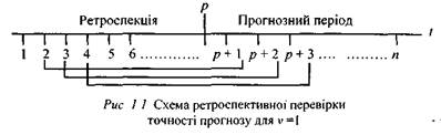Найбільш поширене ретроспективне оцінювання прогнозу, тобто оцінювання прогнозу для минулого часу (ex-post прогноз). Процедура перевірки така. Динамічний ряд поділяється на дві частини: перша — для t = 1,2,3, ...,p — називається ретроспекцією (передісторією), друга — для t=p + 1 , p + 2, p + 3, ..., p +(n —р) — прогнозним періодом.