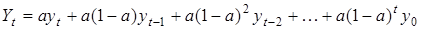 Чим віддаленіший від t- го моменту рівень ряду, тим менша його відносна вага і вклад у тенденцію. Так, при a = 0,2 ваги становлять: для t- го моменту — 0,2 , для ( t – 1 )- го моменту — 0,2(1 -O,2) = 0,16; для (t-2) -ro моменту — 0,2(1 -0,2)2 = 0,128 і т. д. Надаючи більшу вагу новій інформації, експоненційна середня адаптується до нових умов, що робить її досить ефективним і надійним методом короткострокового прогнозування.