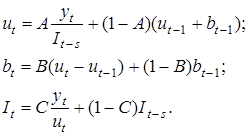 визначається за такою ж самою рекурентною формулою на основі згладженого ряду