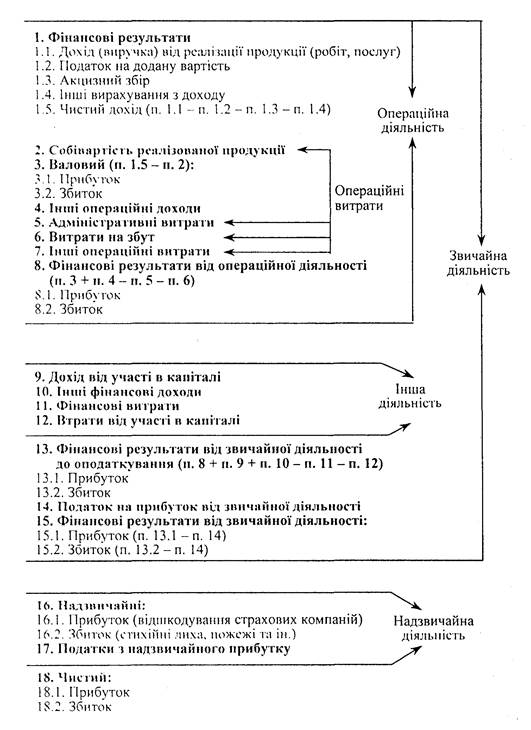 З прийняттям Положення (стандарту) бухгалтерського обліку З "Звіт про фінансові результати" [8] підприємства визначають прибуток-збиток на різних стадіях його формування. Схематично загальний фінансовий результат подано на рис.1.1 Виділяють валовий, операційний прибуток, прибуток від звичайної діяльності до і після оподаткування, чистий прибуток та нерозподілений прибуток.