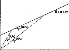 По мере роста Y, С/Y сокращается, равно как и средняя склонность к потреблению С/ Y. (Поскольку средняя склонность к потреблению равна С/ Y, то она соответствует углу наклона линии, проведенной из начала координат до точки, лежащей на линии функции потребления. На рис. 1-1 можно видеть, что АРС сокращается по мере роста дохода. И, наконец, эта функция потребления удовлетворяет третьему положению Кейнса потому, что процентная ставка не входит в это уравнение в качестве определителя потребления.