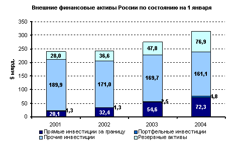 Объем внешних финансовых активов России по состоянию на 1 января 2004 г. составил $315,1 млрд., что на 14,8% превышает значение на 1 января 2003 г. На рисунке 1 представлена динамика внешних активов РФ с начала 2001 г.[23]