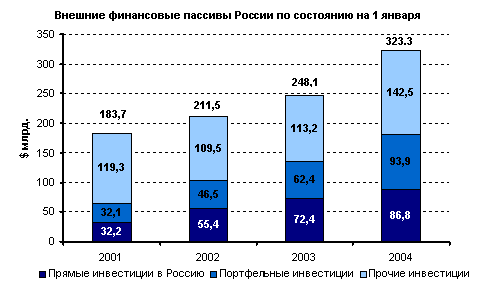 Объем российских внешних финансовых обязательств по состоянию на начало 2004 г. возрос до $323,3 млрд. или на 30,3% по сравнению с началом предыдущего года. Динамика внешних обязательств России с начала 2001 г. представлена на рисунке 2.[24]