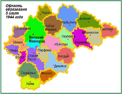 Новгородская область была образована 5 июля 1944 года. Территория НО составляет 55,3 тысяч квадратных километров. Она имеет общие границы с Псковской, Вологодской, Ленинградской и Тверской областями (Приложение 1). Самыми крупными городами региона являются Великий Новгород, Старая Русса, Боровичи, Чудово, менее крупные города - Пестово, Валдай, Окуловка, Малая Вишера и другие (Приложение 2).