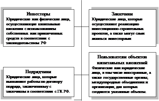 - инвесторы (заказчики, застройщики) в лице государства, частных предприятий и предприятий иных форм собственности, граждан, иностранных фирм и граждан, вкладывающих инвестиции в создание или поддержание в рабочем состоянии основных фондов;
