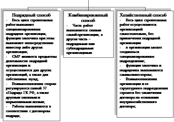Подрядный способ – весь цикл строительно-монтажных работ выполняется специализированной подрядной организацией, при этом функции инвестора выполняет инвестор либо другая организация.[7]