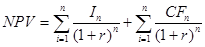 NPV = -I+CF/(1+r)+CF/(1+r)2 +CF/(1+r)3 +PV,
