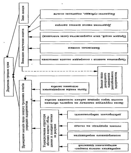 Нарешті, якщо всі перелічені вище заходи, що переважно мають одноразовий характер, не забезпечують одержання достатньої грошової суми, слід зосередити увагу на можливостях докорінного поліпшення ефективності роботи підприємства. Це стосується підвищення рентабельності та якості продукції, впровадження нової техніки І технології, реорганізації виробництва і управління тощо (рис. ,11). За відсутністю джерел фінансування і часу залишається тільки одна можливість — оголошення підприємства банкрутом.