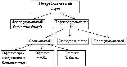 Нефункциональный спрос - спрос, обусловленный факторами, не связанный с самим товаром. Особое значение при нефункциональном спросе имеют случаи взаимного влияния рыночного и индивидуального спроса, которые американский экономист Х. Лейбенстайн назвал эффектом присоединения к большинству (потребитель покупает то же, что и другие потребители), эффект сноба (стремление выделиться из толпы) и эффект Веблена (престижное или демонстративное потребление).