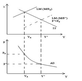 Кривая совокупного спроса (AD ) показывает комбинации уровня цен и уровня выпуска, при которых рынки товаров и рынки активов одновременно находятся в равновесии. Ее легко получить из модели IS- LM . Обратимся сначала к графическому выводу кривой совокупного спроса. Зафиксировав цены на уровне P0 , найдем соответствующий равновесный доход Y0 и изобразим эту точку в осях Y- P . Рассмотрим более низкий уровень цен P’ (P’< P0 ). Падение цен приводит к росту реального предложения денег и сдвигает кривую LM вправо, что ведет к росту равновесного дохода. Итак, более низкому уровню цен P’ соответствует более высокий уровень равновесного дохода Y’ (Y’> Y0 ). Таким образом, мы получаем кривую совокупного спроса, которая является функцией цен (рис.1)