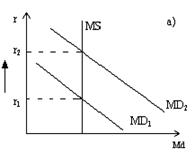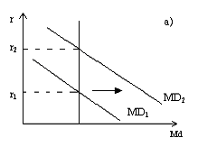 Последствия увеличения спроса на деньги представлены на рисунке 9а. Так как правительство не корректировало объем денежной массы, положение вертикальной кривой предложения не изменяется. Когда увеличение уровня доходов вызывает сдвиг кривой спроса на деньги вправо, из MD1 к MD2 , для сохранения равновесия спроса и предложения процентная ставка должна повыситься от r1 до r2 .