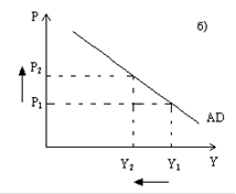 1) Отрицательный наклон: повышение уровня цен ведет к сокращению реального предложения денег и порождает избыточный спрос на деньги или избыточное предложение облигаций. В результате цена облигаций падает, а значит, ставка процента растет, что ведет к падению инвестиций и равновесного дохода. Формально наклон кривой совокупного спроса можно получить из модели IS- LM , которая в закрытой экономике имеет вид: