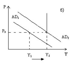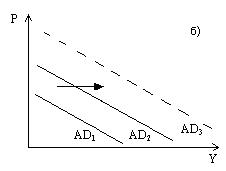 государственных закупок ведет к увеличению спроса на товары и услуги, но следствием данного процесса может быть вытеснение инвестиций, что частично компенсирует воздействие государственных закупок на совокупный спрос (см. рис.9б). Увеличение правительственных расходов прежде всего приводит к сдвигу совокупного спроса из AD1 в AD2 , но вследствие эффекта вытеснения она возвращается к AD3 .