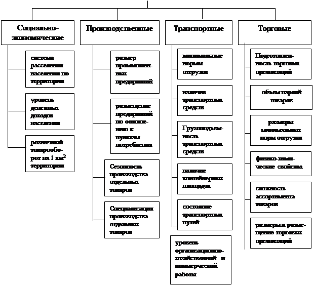 К производственным факторам относятся: размер промышленных предприятий и их размещение по отношению к пунктам потребления, специализация и сезонность производства отдельных товаров.