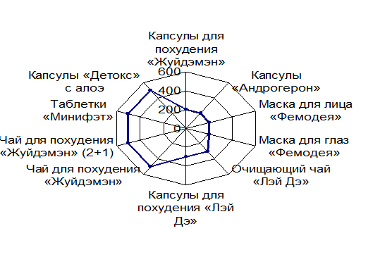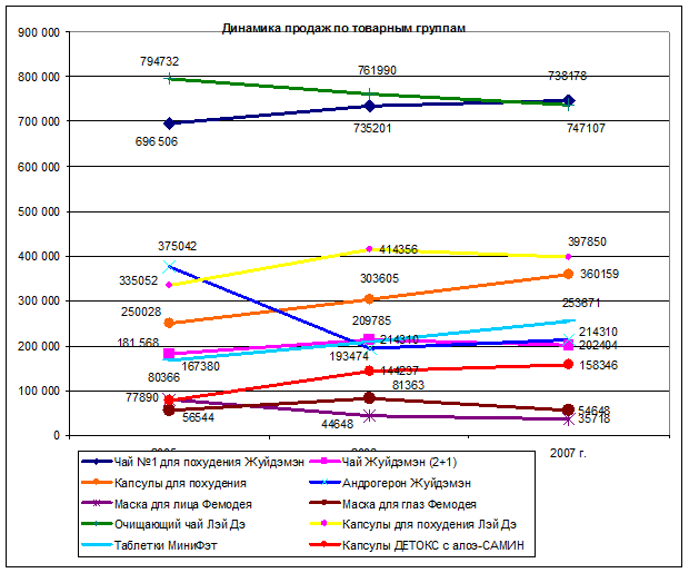 6. Предприятию удалось выполнить и перевыпонить план по продаже по таблеток «МиниФэт» - (+ 9,93%) и капсул ДЕТОКС с алоэ-САМИН – (+5,56%), выполнен план по товару Андрогерон Жуйдэмэн - (+ 0,37%), по остальным группам товаров план не выполнен. Разумеется, что кардинальный план изменения структуры продаж не мог оправдать себя за столь короткий срок без определенных мер, направленных на изменение структуры продаж. Такими мерами могли бы стать следующие: введение скидок на определенные группы товаров. При этом, чтобы не потерять часть прибыли можно было бы применить систему товар в нагрузку: при покупке товара пользующегося средним и малым спросом ввести систему «два по цене одного» или при заказе 5 единиц, 6 – бесплатно. Даже проведение одной такой разовой акции могло бы существенно изменить структуру продаж товара. Но руководство предприятия не захотело идти по данному пути. Результат традиционного пути был проанализирован выше.