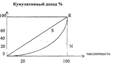 Отношение площади фигуры S к общей площади треугольника OEN называется коэффициентом концентрации доходов или коэффициента Джини.