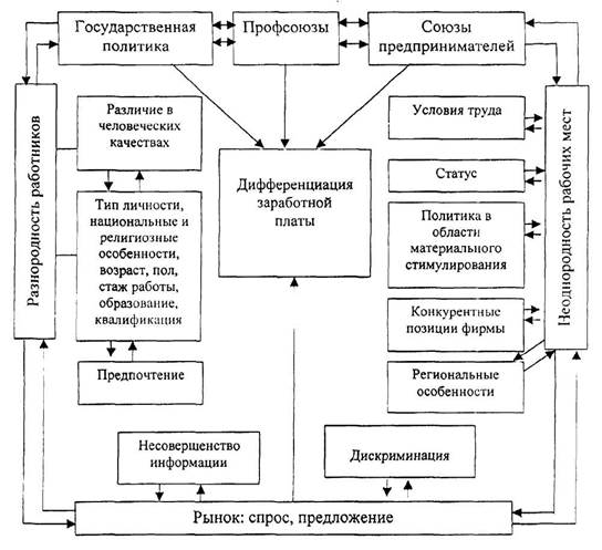 Теория человеческого капитала, теория мотивации и теория рынка труда во многом объясняют природу дифференциации в оплате труда. Дифференциация заработной платы - такое же естественное явление, как и многообразие цен на другие рыночные товары, определяемое спросом и предложением качественными характеристиками, потребительскими свойствами, полезностью торгуемых продуктов и услуг. С другой стороны различия в оплате труда во многом определяется поведением самого человека: его предпочтениями; неоднородностью психофизиологических качеств, образованием. На дифференциацию заработной платы несомненное влияние оказывают государственное регулирование, профсоюзы, несовершенство самого рынка труда.