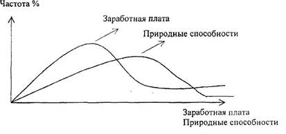 Проведенные экономистами, исследования показывают, что дифференциация заработной платы не соответствует распределению природных способностей, которые распределяются нормальным образом (см. рис.2).