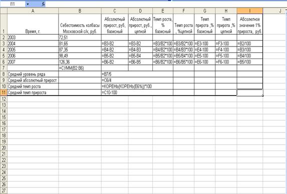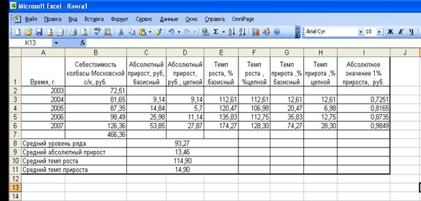 3. Так как в нашем примере средний темп прироста величины себестоимости производства колбасы «Московская», выпускаемых компанией ЗАО МПК «Мясной ряд» за период с 1.01.03г. по 1.01.07г. характеризуется положительным значением (14,90), что свидетельствует о ежегодном увеличении величины себестоимости производства колбасы «Московская» за наш период.
