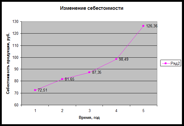 4. Абсолютный прирост показывает, что в наш период в среднем происходило увеличение величины себестоимости производства колбасы «Московская» на -13,46 руб. в год.