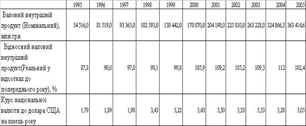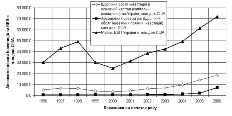 Проведений в роботі статистичний аналіз щорічних рівней ВВП України, загальних обсягів капітальних інвестицій та обсягів іноземних інвестицій в економіку України, приведених в єдиних одиницях виміру – доларах США (з врахуванням поточного курсу національної валюти України на кінець кожного звітного року) характеризується нелінійними залежностями, для яких у 1995 –2005 роках характерні наступні участки: