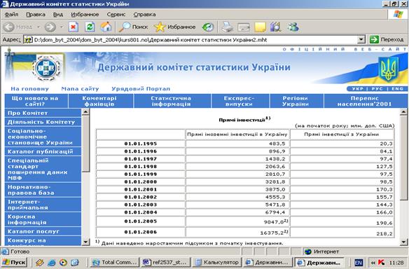 Мета контрольної роботи – статистична оцінка динаміки абсолютних показників та структури прямих іноземних інвестицій в економіку України у 1995 – 2005 роках.