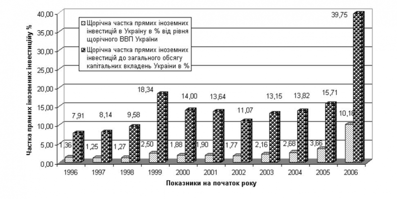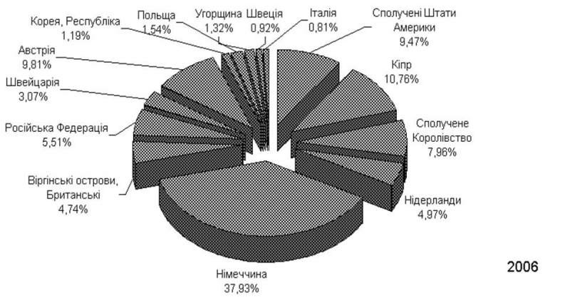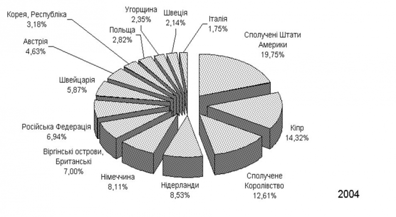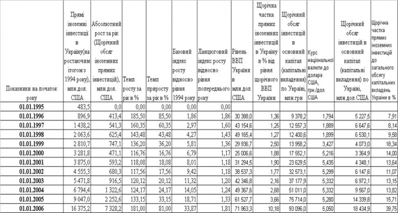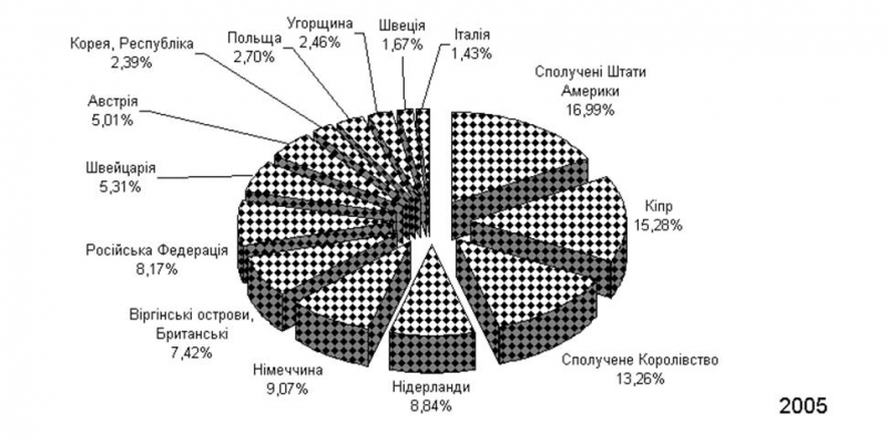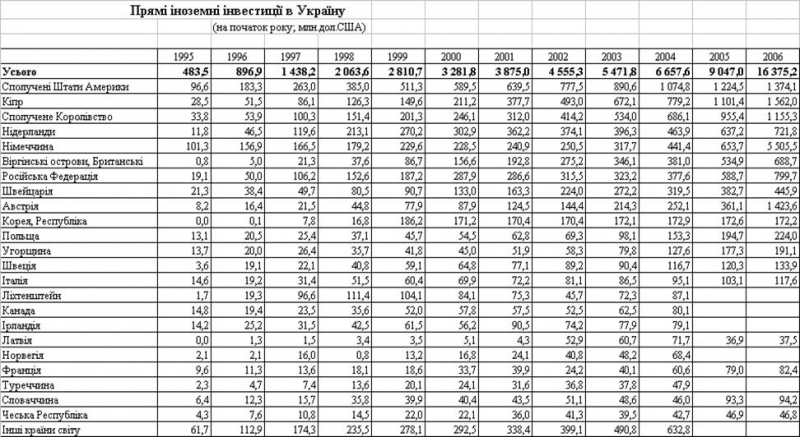 Загальний накоплений обсяг прямих іноземних інвестицій в Україну на 01.01.2006 р. становив 16 372,2 млн. дол. США, з них біля 5 500 млн.доларів США (30%) надійшли у 2005 році в вигляді прямих інвестицій придбання “Криворіжсталі” (інвестор – Німеччина) та АППБ “Аваль” (інвестор – Австрія), що суттєво змінило структурні співідношення в обсягах та географії інвестицій, які надійшли в Україну зі 113 країн світу.