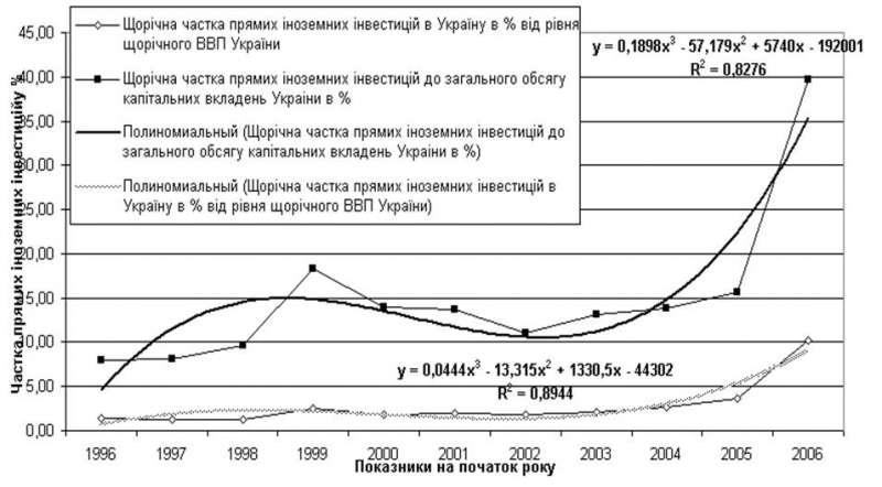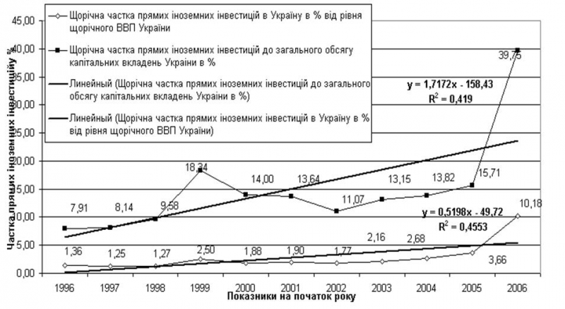 Лінійний та нелінійний регресійний аналіз залежностей щорічних обсягів іноземних інвестицій відносно щорічних обсягів ВВП України та відносно щорічних обсягів загальних прямих капітальних інвестицій в економіці України, проведений з застосуванням інструментів графо-статистичного аналізу в “електронних таблицях” EXCEL-2000, показав що: