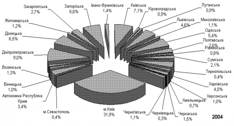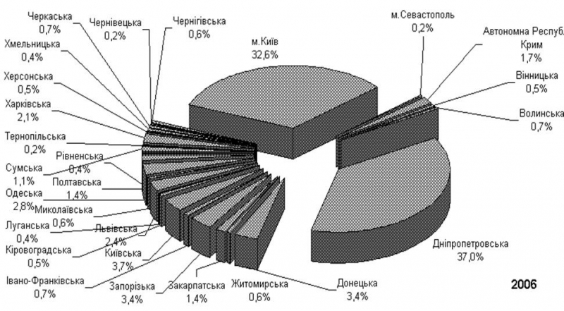 Аналіз розподілу сум прямих іноземних інвестицій, вкладених в економіку України по областям та виділеним містам України станом на 01.01.2004 року та на 01.01.2006 року показує, що найбільші частки інвестовані в наступні промислово-розвинуті області України: