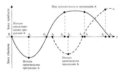 Для сохранения уровня прибыли на предприятии важно определить момент начала проектирования и запуска в производство новой продукции. Дело в том, что этап проектирования и освоения продукции занимает определенное время, в течение которого предприятие несет убытки (0; t1 ). Затем с момента запуска продукции в производство (t1 ) убытки начинают снижаться и через некоторое время достигается точка безубыточности (t2 ). При увеличении объема продаж растет и прибыль за счет снижения доли постоянных расходов (t2 ; t4 ). При достижении равновесия спроса и предложения размер прибыли стабилизируется и некоторое время остается на неизменном уровне (t4 ; t7 ). Такое положение может сохраняться довольно длительное время при отсутствии угрозы со стороны конкурентов и при стабильном спросе на продукцию. При наличии конкурентов поддержание уровня продаж достигается путем снижения рентабельности, т.е. понижения цены за счет доли прибыли. Эффективность начинает снижаться (t7 ; t9 ).