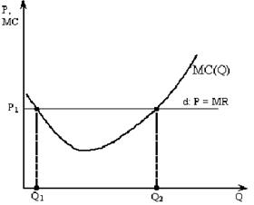 На рис. 2.2 видно, что кривая предельных издержек пересекает линию спроса в двух точках: при объёме выпуска  и при объёме выпуска