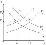 . Однако, рынок может поставить товаров лишь в объеме qt. Возникает товарный дефицит. Возникает давление на рынок со стороны дополнительного спроса. Цена движется от Рt к Rt . Производители в этом случае будут увеличивать объемы продаж. Поведение производителей будет описываться новой кривой предложения  . Положение на рынке вновь изменится, но в другую сторону. Предложение подтягивается к спросу и цена начнет снижаться к новой отметке равновесия N.