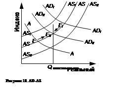 на любом отрезке кривой совокупного предложения. На горизонтальном отрезке равновесие достигается без инфляции, на восходящем – при некотором повышении цен, на вертикальном – в условиях инфляции.