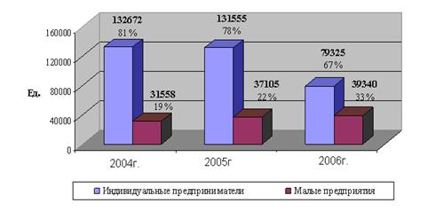 В своей работе я проанализировал динамику зарегистрированных индивидуальных и малых предпринимателей за последние годы, а так же отразил долевое распределение их по отраслям экономики.