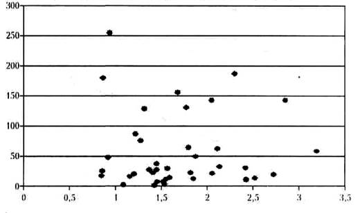 Рисунок 1. Диаграмма рассеяния интенсивности взяток (ось Х) и среднего размера взятки |