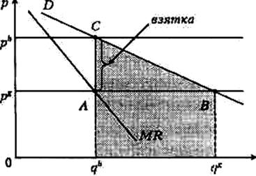 (см. рис. 3). Правительство, в случае когда бюрократ берет взятку, получает от продажи данного общественного блага доход, равный площади прямоугольника O р g А qb . Если бы коррупции не было, правительство получило бы доход, равный площади прямоугольника O р g В qg . То есть в результате появления коррупции государство недополучает сумму, равную площади фигуры qb АВ qg .