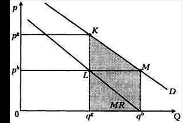 вестна та общая сумма, которой располагает покупатель (обычно это закрытая информация, которая носит частный характер), поэтому, назначая слишком высокую цену (больше располагаемой суммы), продавец может потерять такого покупателя. Рассмотрим ситуацию «коррупции с кражей», при которой величина взятки р b меньше, чем официально установленная государством цена р g . Как видно из рисунка 4, если бы не было коррупции, то государство получило бы доход, равный площади прямоугольника О pg К qg , от продажи данного общественного блага в объеме qg по цене р g . Появление коррупции в рассматриваемой ситуации, когда официальная цена больше взятки, вызывает потерю государством указанной величины дохода за счет перераспределения этой суммы между потребителями общественного блага и бюрократами. Часть этой суммы, представленная верхним прямоугольником pb pg KL , достается потребителю за счет перераспределения потребительского излишка в результате покупки данного блага по более низкой цене и в большем объеме, а нижняя часть — прямоугольник Opb Lqg — «уходит» бюрократу за счет того, что он ничего не отдает правительству, так как скрывает сам факт предоставления общественного блага. Кроме того, потребителю также достается дополнительный выигрыш, равный площади треугольника L КМ (за счет расширения потребления), а бюрократу — выигрыш, равный площади прямоугольника qg LMqb (рис. 4).