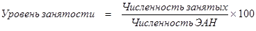 Масштабы вовлечения населения в общественное производство, в общественный труд характеризуются показателями численности занятых и численности экономически активного населения (рабочей силы), а степень вовлечения – уровнем занятости (3) и коэффициентом (уровнем) экономической активности трудоспособного населения (4), исчисляемыми в процентах.