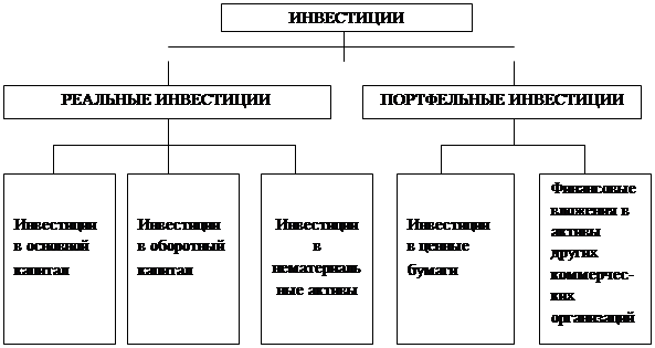 Инвестиции принято делить на портфельные и реальные. Портфельные (финансовые) инвестиции — вложения в акции, облигации, другие ценные бумаги, активы других предприятий. Реальные инвестиции — вложения в создание новых, реконструкцию и техническое перевооружение действующих предприятий. В этом случае предприятие-инвестор, вкладывая средства, увеличивает свой производственный капитал — основные производственные фонды и необходимые для их функционирования оборотные средства.