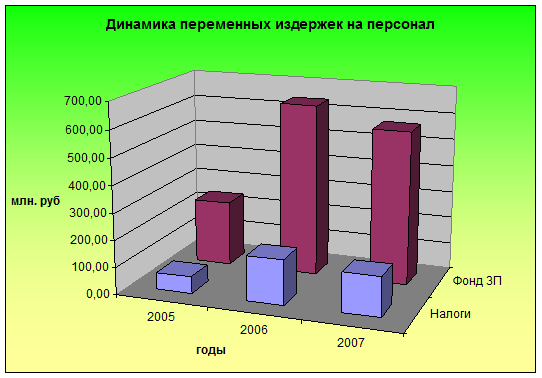 В целом можно сделать вывод, что расходы на персонал эффективны, так как увеличение затрат на персонал сопровождается и увеличением объемов производимой продукции и прибыли. 2006 год для завода ООО «Борец» был переломным, т.к. поменялась политика предприятия относительно выплаты заработной платы. В связи с этим, в 2006 году наблюдается резкий скачек вверх затрат на персонал, и достаточно сильный скачек вниз прибыли. Но уже в 2007 году ситуация немного стабилизировалась – затраты на персонал были немного снижены, а показатели прибыли и объема производимой продукции начали расти.