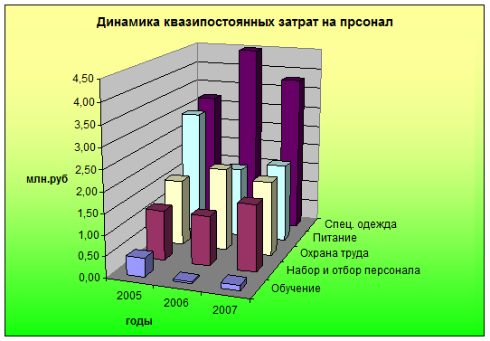 Как видно из данных таблицы, объем произведенной продукции возрос в 2006 г. по сравнению с 2005 г. на 24 %, а в 2007 г. по сравнению с 2006 г. на 13 %. Однако, затраты на персонал в 2006 году по сравнению с 2005 увеличились на 260%, а в 2007 году по сравнению с 2006 сократились на 11%. В результате коэффициент экономической эффективности затрат на персонал в 2005 году имел наибольшее значение за весь исследуемый период 3,62. В 2006 году коэффициент экономической эффективности снижается до 1,72 из-за резкого увеличения затрат на персонал. В 2007 году затраты на персонал сократились на 11%, что привело к росту коэффициента экономической эффективности с 1,72 до 2,18. Если в 2008 году затраты на персонал останутся на уровне 2007 года, а объем произведенной продукции продолжит свой рост, то возможно коэффициент экономической эффективности достигнет уровня 2005 года .