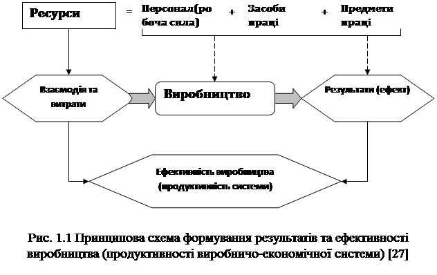 Процес формування результатів та ефективності виробництва (продуктивності системи) показано на рис. 1.1.