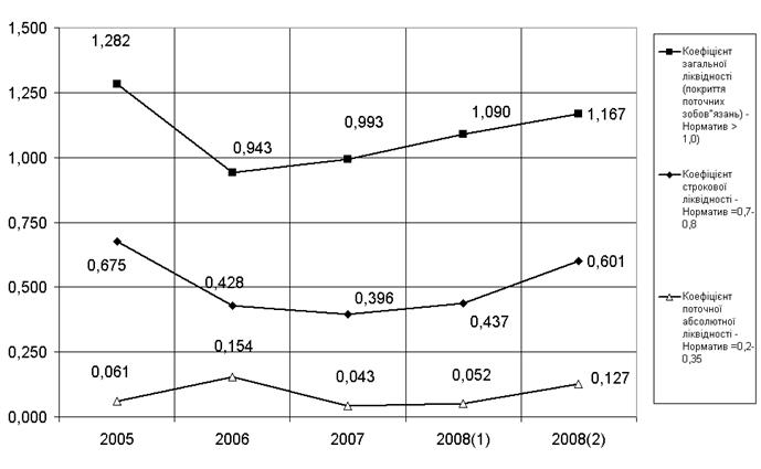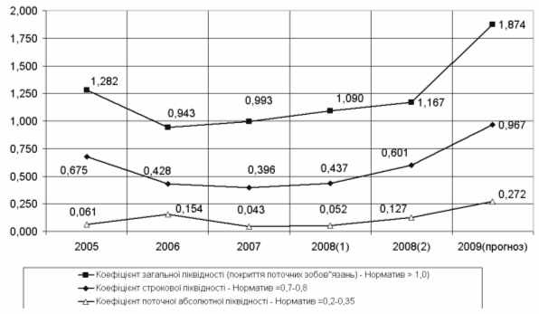 Рис.В.5. Динаміка показників ліквідності балансу ТОВ „Металоіндустрія Плюс” у 2005 –2008 роках