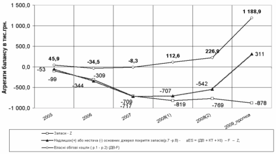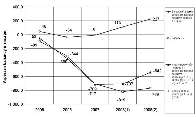 Рис.В.9. Динаміка показників фінансової стійкості по покриттю запасів усіма видами ресурсних джерел в ТОВ „Металоіндустрія Плюс” у 2005 –2008 роках