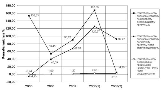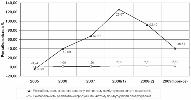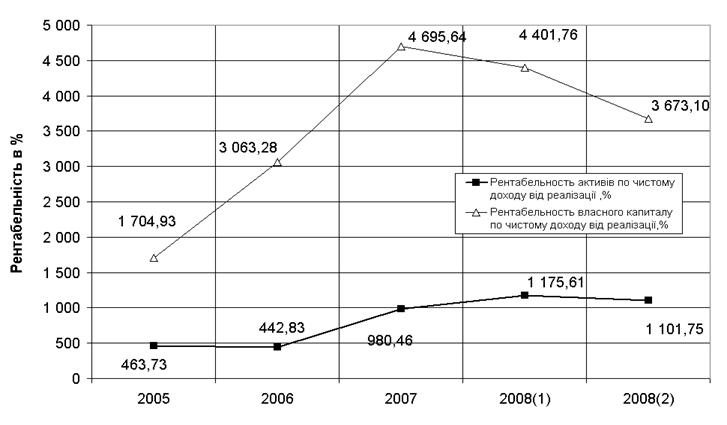 Рис.В.11 Динаміка показників рентабельності активів та власного капіталу по чистому доходу від реалізації в ТОВ „Металоіндустрія Плюс” у 2005 –2008 роках