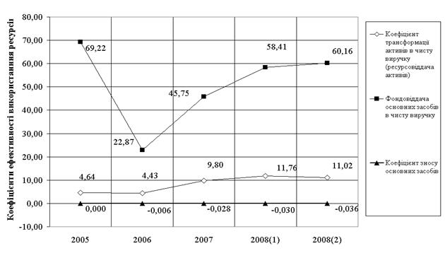 Рис.В.8. Динаміка показників ресурсовіддачі активів та фондовіддачі основних засобів в ТОВ „Металоіндустрія Плюс” у 2005 –2008 роках