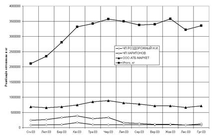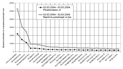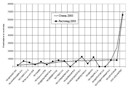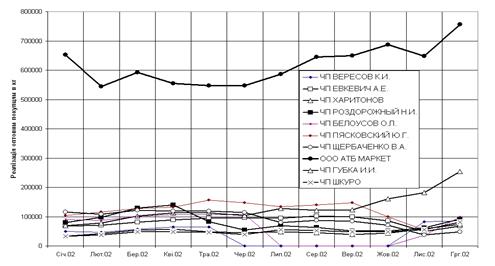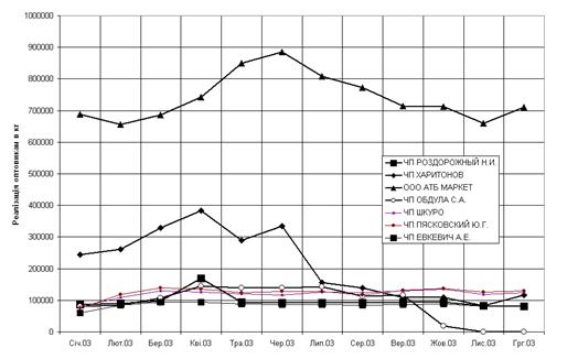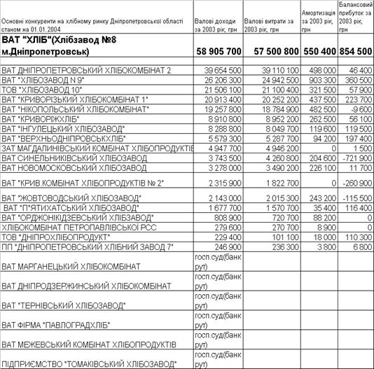 - обсяг валового доходу за 2003 рік у найближчого конкурента (Хлібокомбінат № 2 м. Дніпропетровська) становить 396 млн.грн, тобто менший більш ніж на 30%.